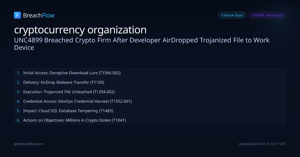 North Korean threat actor UNC4899 (Jade Sleet, PUKCHONG, Slow Pisces, TraderTraitor) compromised a cryptocurrency organization in 2025. The attack began with social engineering to trick a developer into downloading a malicious file, which was then AirDropped to a corporate device. The attackers exploited DevOps workflows, harvested credentials, tampered with Cloud SQL databases, and ultimately stole millions of dollars in cryptocurrency.