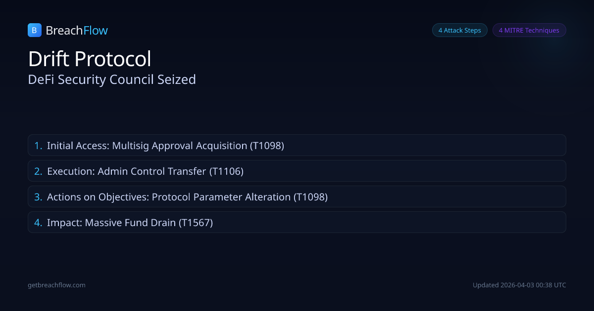 Drift Protocol, a DeFi trading platform on Solana, lost at least $280 million after an attacker gained control of its Security Council administrative powers. The attacker used durable nonce accounts and pre-signed transactions to execute a sophisticated, delayed takeover, introducing a malicious asset and removing withdrawal limits to drain funds.