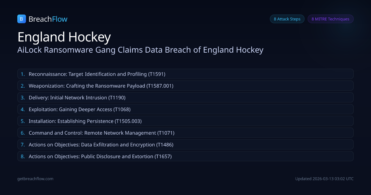 The AiLock ransomware group identified England Hockey as a potential target, likely gathering information about its operations, data holdings, and potential vulnerabilities. This phase involves understanding the organization's structure and the value of its data.