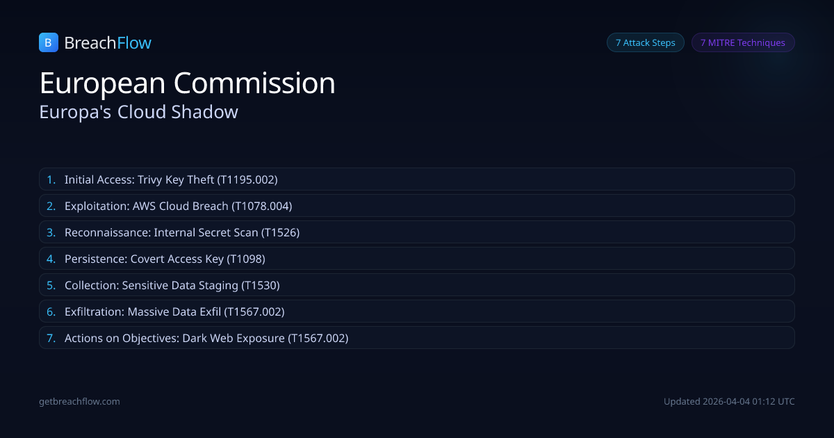 The European Commission suffered a cloud hack attributed to TeamPCP, which leveraged a compromised AWS API key obtained via the Trivy supply-chain attack. The group used TruffleHog for secret discovery and deployed "TeamPCP Cloud Stealer" malware, leading to the exfiltration of 90GB of data, including personal information and 51,992 email communications (2.22 GB), affecting 42 internal Commission clients and 29 other EU entities. The stolen data was subsequently published by ShinyHunters on a dark web leak site.