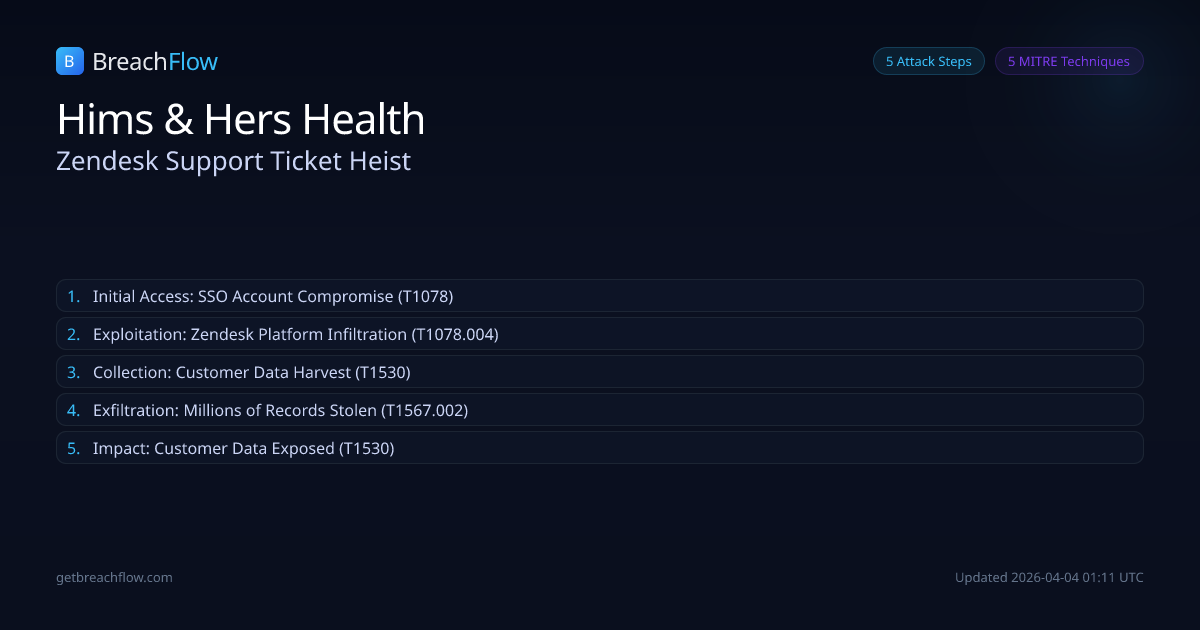 Telehealth company Hims & Hers suffered a data breach in February 2026 after the ShinyHunters extortion gang compromised their Zendesk customer service platform. The attackers used stolen Okta SSO accounts to gain unauthorized access and exfiltrate millions of support tickets containing names, contact information, and other personal data.