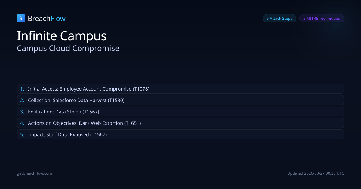Infinite Campus, a K-12 student information system provider, suffered a data breach after the ShinyHunters threat group accessed an employee's Salesforce account. The attackers exfiltrated Salesforce records containing names and contact details for school staff and internal corporate data, then attempted to extort the company.