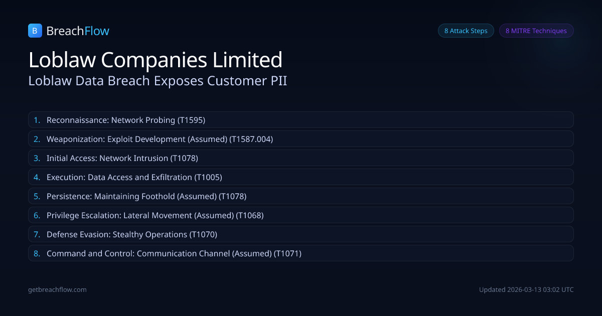 Canadian retail giant Loblaw experienced a data breach where hackers accessed a portion of its IT network, compromising basic customer information including names, phone numbers, and email addresses. The company has notified affected customers and is advising them to be vigilant for phishing attempts and to change their passwords. Financial and health information were reportedly not affected.