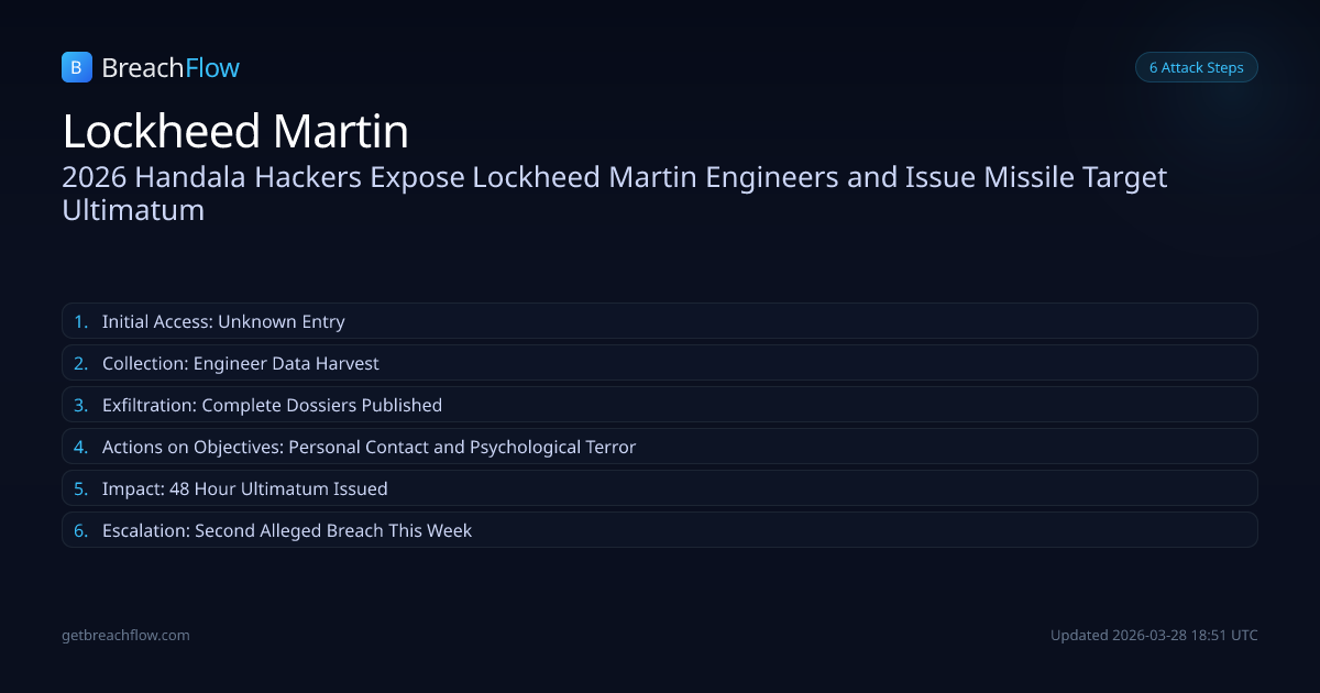 Lockheed Martin is the world's largest defense contractor, producing advanced military aircraft including the F-35 fighter jet, missiles, and defense systems for the US military and allied nations worldwide. Iran-linked Handala hackers claimed to have obtained complete personal data on 28 senior Lockheed Martin engineers working in Israel, publishing passport scans, home addresses, family details, and personally calling the engineers to demonstrate they had their information. A 48 hour ultimatum was issued demanding engineers cease work or have their homes designated as missile targets. The FBI had already seized Handala domains one week prior.