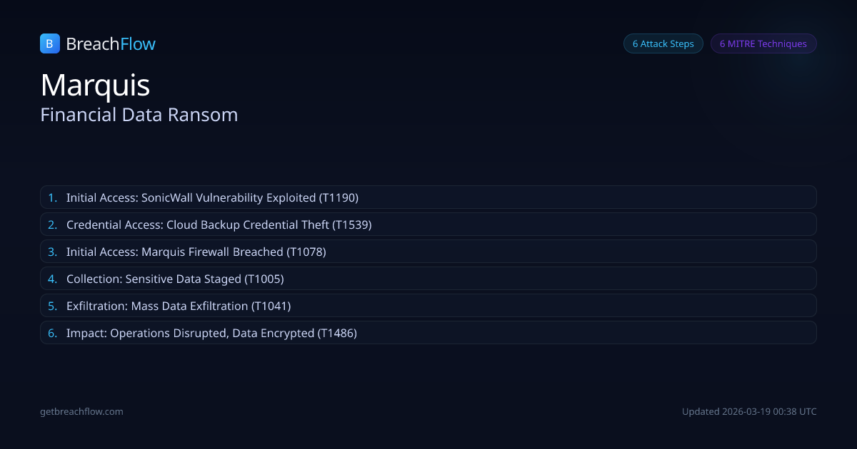 A ransomware gang compromised Marquis, a Texas-based financial services provider, in August 2025 by exploiting a vulnerability in a SonicWall firewall. The attack led to the theft of personal and financial data for 672,075 individuals and disrupted operations at 74 banks across the United States.