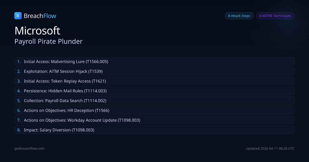 Financially motivated threat actor Storm-2755 targeted Canadian employees of Microsoft using malicious Microsoft 365 sign-in pages to steal authentication tokens and session cookies. This enabled them to bypass MFA and hijack salary payments by manipulating direct deposit information in HR platforms like Workday.