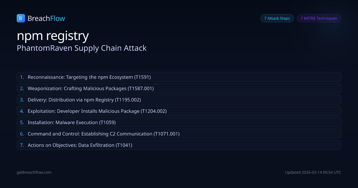 The PhantomRaven campaign has launched new waves of attacks against the npm registry, distributing 88 malicious packages via 50 disposable accounts. These packages employ 'slopsquatting' and Remote Dynamic Dependencies (RDD) to evade detection and exfiltrate sensitive data from JavaScript developers, including credentials, CI/CD tokens, and system information, sending it to attacker-controlled C2 servers.