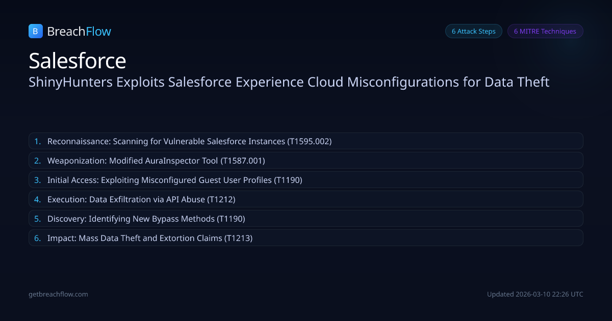 The threat actor ShinyHunters has claimed responsibility for ongoing data theft attacks targeting Salesforce Experience Cloud platforms. The attacks exploit misconfigured guest user profiles, allowing unauthorized access to sensitive data via the /s/sfsites/aura API endpoint. While Salesforce states the platform is secure and the issue stems from customer misconfigurations, ShinyHunters claims to have compromised hundreds of companies, including those in the cybersecurity sector, by exploiting vulnerabilities in access control settings and API query limitations.