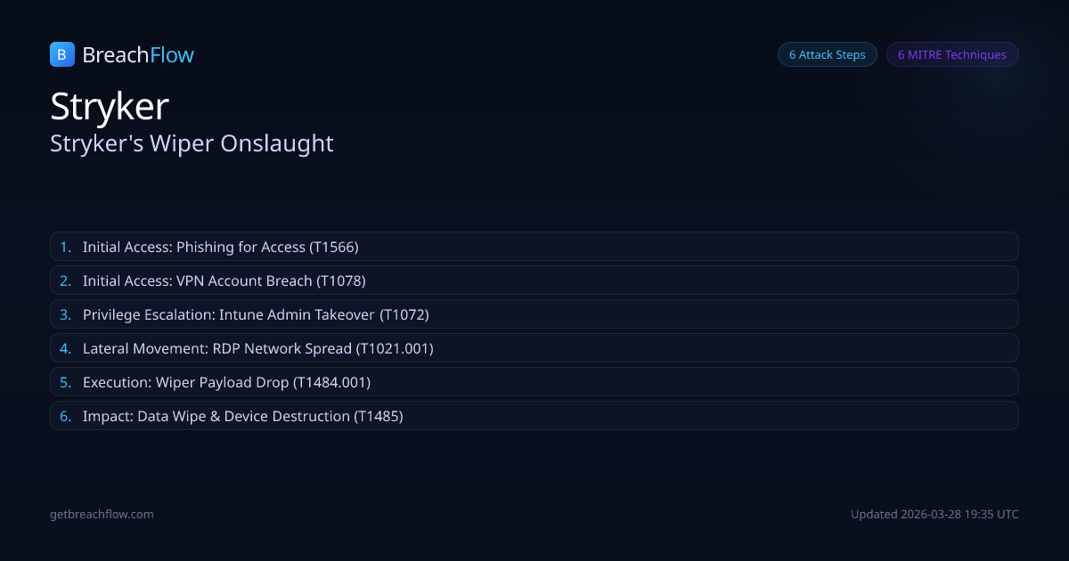 Iran-linked Handala Hack (MOIS-affiliated) breached medical device provider Stryker, deleting a huge trove of company data and wiping thousands of employee devices. Initial access was gained through compromised credentials, likely via infostealer malware or phishing, leading to administrative access via Microsoft Intune. The group also separately leaked personal emails of FBI Director Kash Patel.
