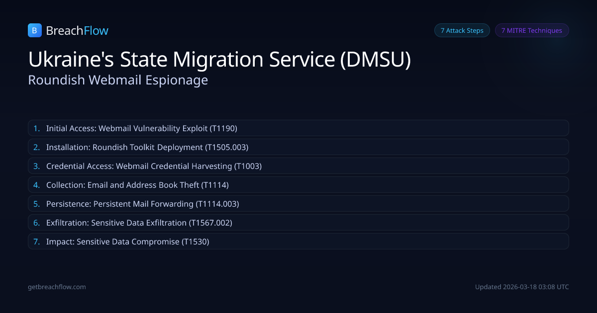 APT28, also known as Fancy Bear, exploited Roundcube webmail vulnerabilities to deploy the Roundish toolkit. This toolkit enabled credential harvesting, persistent mail forwarding, bulk email exfiltration, address book theft, and 2FA secret extraction from mail.dmsu.gov.ua.