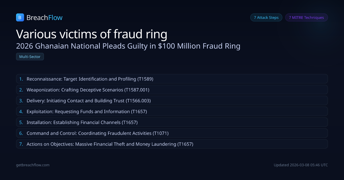 A Ghanaian national, Derrick Van Yeboah, pleaded guilty to his role in a large-scale fraud operation that defrauded victims of over $100 million through business email compromise attacks and romance scams. The operation, based in Ghana, targeted Americans between 2016 and May 2023. Van Yeboah was a high-ranking member and personally conducted many romance scams, linked to over $10 million in losses. He agreed to pay over $10 million in restitution and faces up to 20 years in prison.